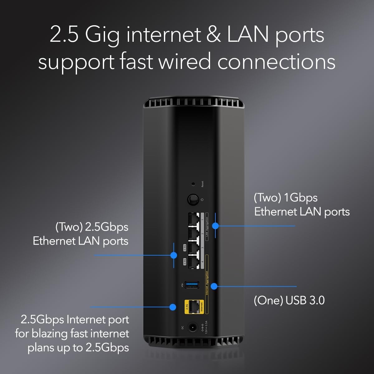 The high-performance antenna design provides up to 2,500 sq. ft. WiFi coverage, and you can connect your high-demand devices to the two 2.5 Gig and two 1 Gig LAN ports for fast wired speed. Sleek new body with smaller footprint and high-performance antennas for up to 2,500 sq. ft. of WiFi coverage.