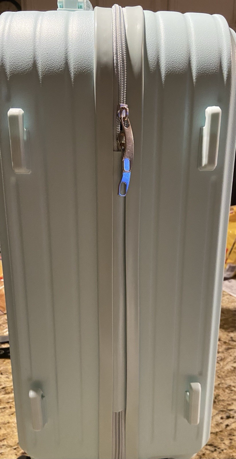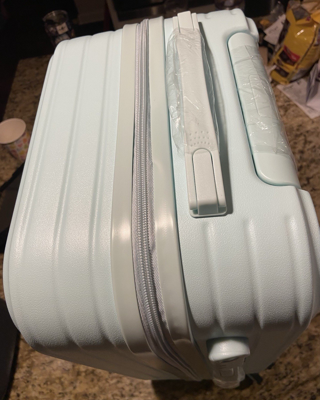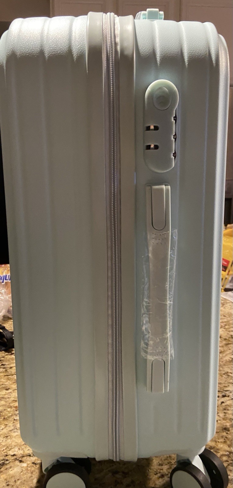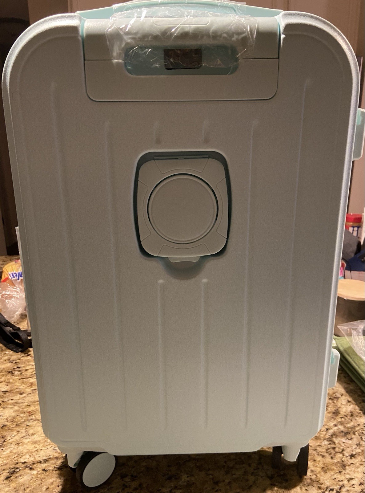 The product is a stylish mint green hardback carry-on suitcase with a cup holder, usb port, and makeup bag. This suitcase features a solid pattern, TSA security lock, and is made of durable ABS plastic material.