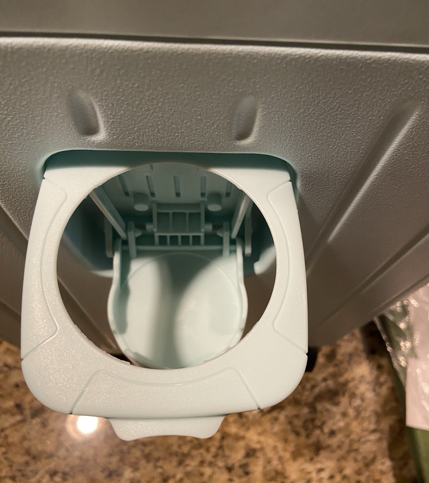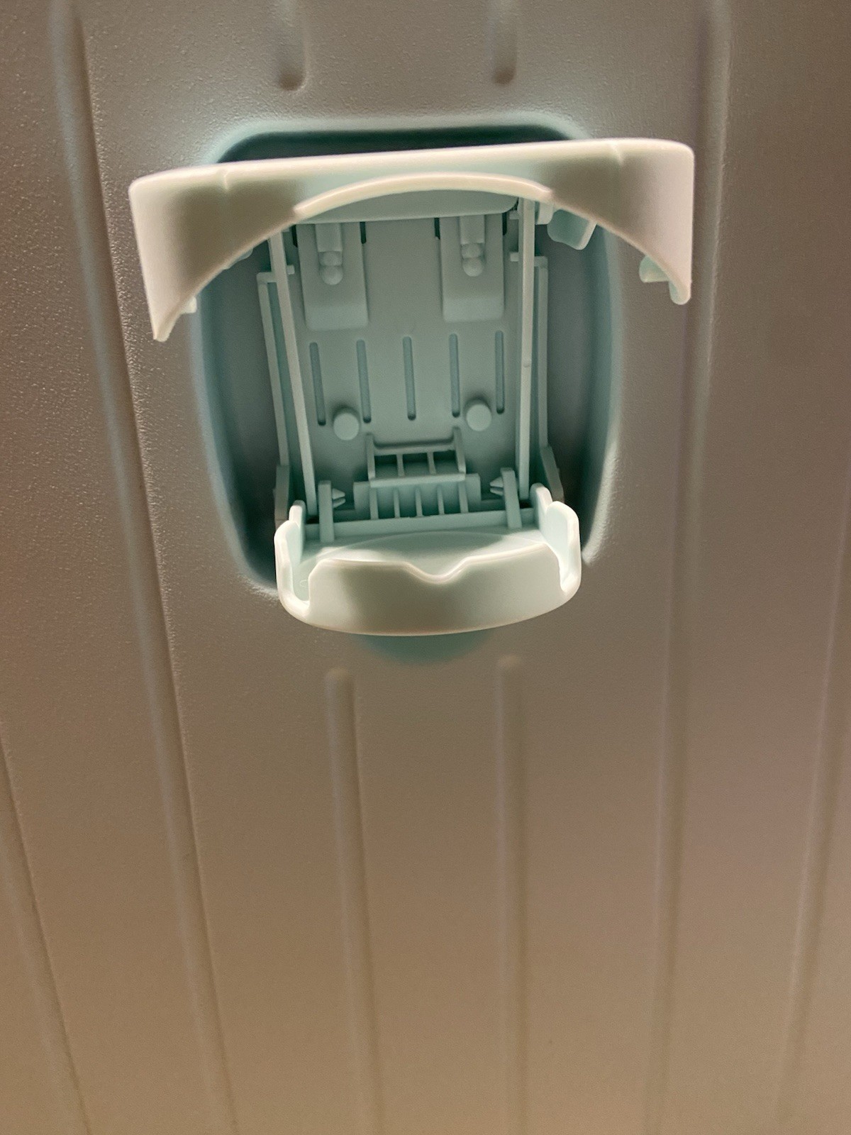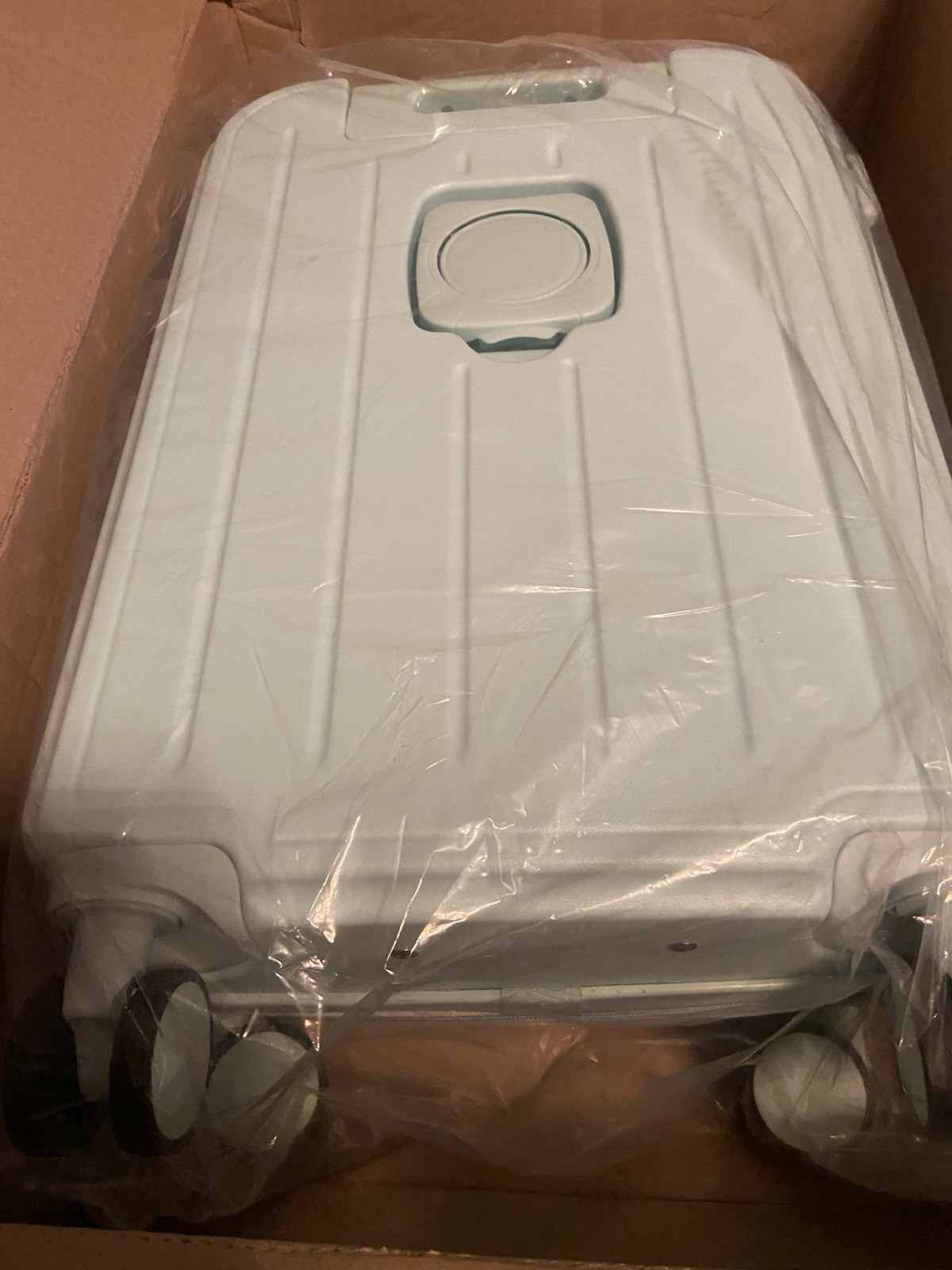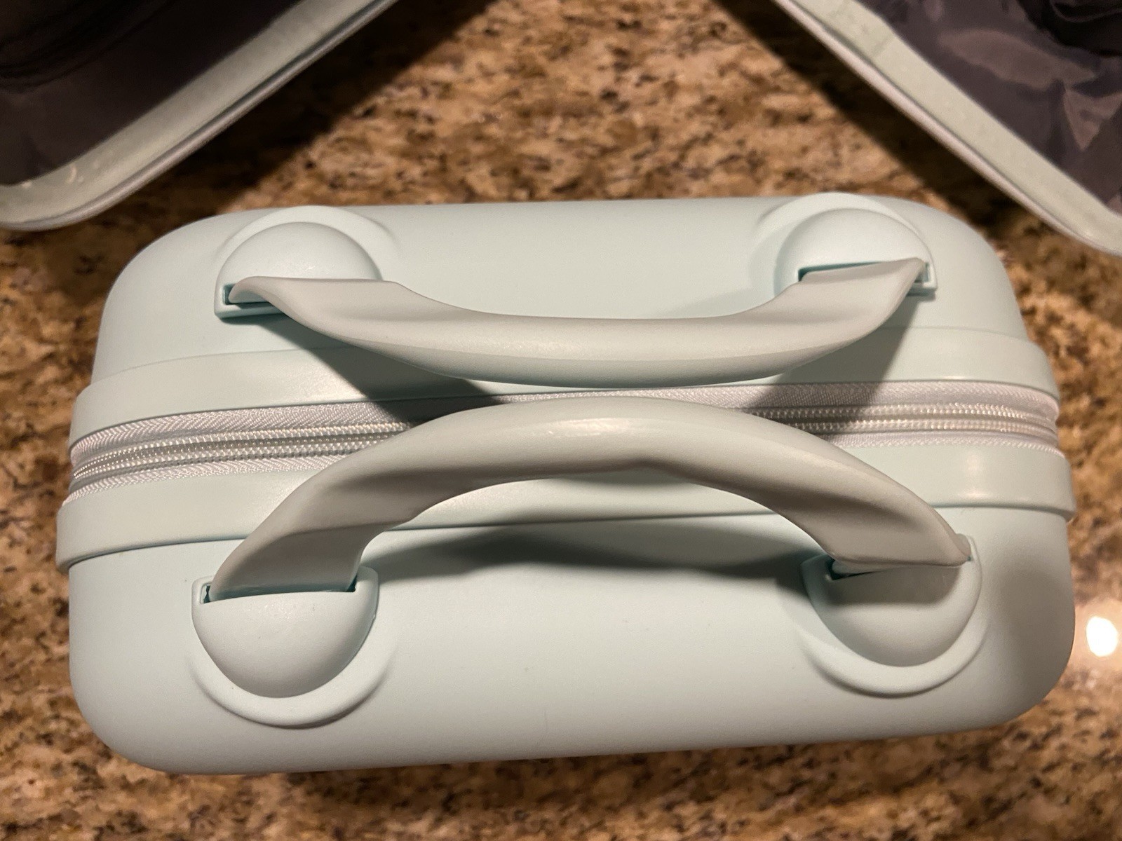 The product is a stylish mint green hardback carry-on suitcase with a cup holder, usb port, and makeup bag. This suitcase features a solid pattern, TSA security lock, and is made of durable ABS plastic material.