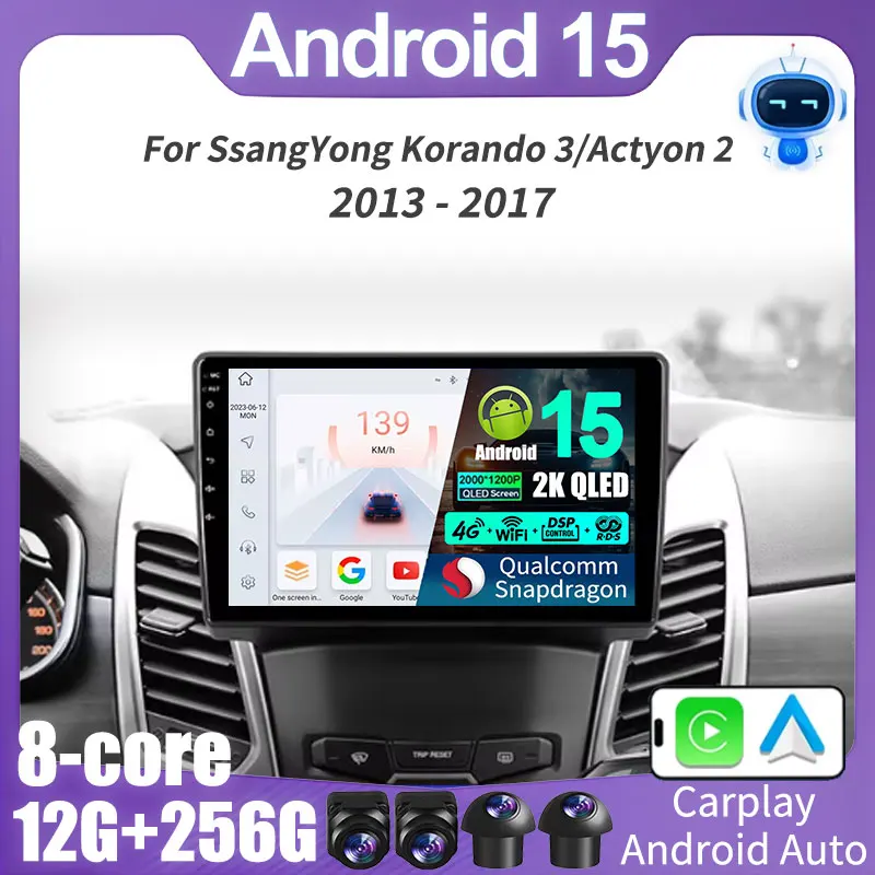 Android 15 For SsangYong Korando 3 Actyon 2 2013 - 2017 2K QLED Stereo Car Radio Multimedia Video Player GPS 4G CarPlay 360 DSP $111.33