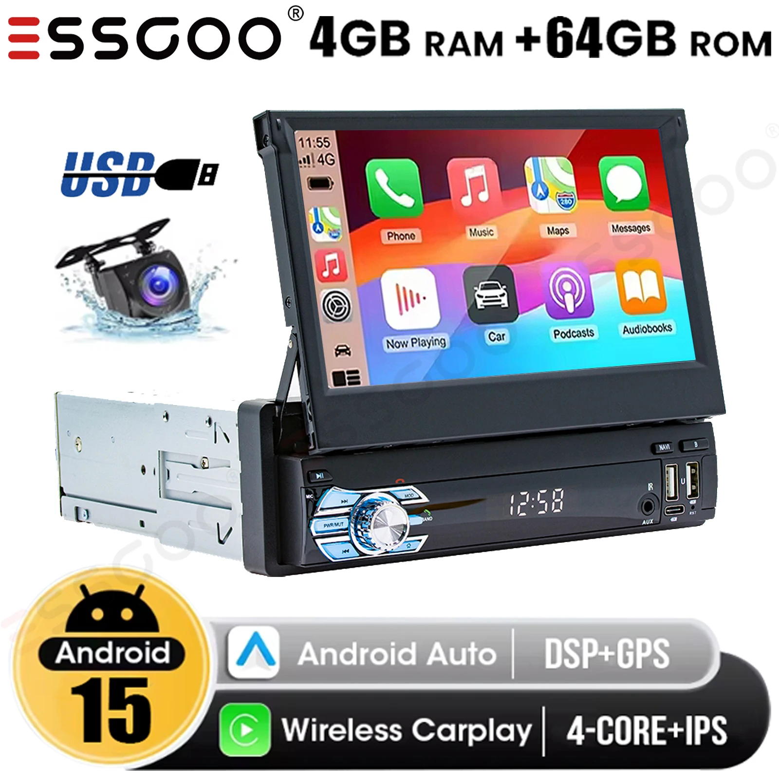 7" Single 1 DIN Android 15 4+64GB Flip Out USB Car Stereo Radio Touch Screen Apple Carplay GPS Navi ASP Head Unit WiFi BT+Camera $99.88