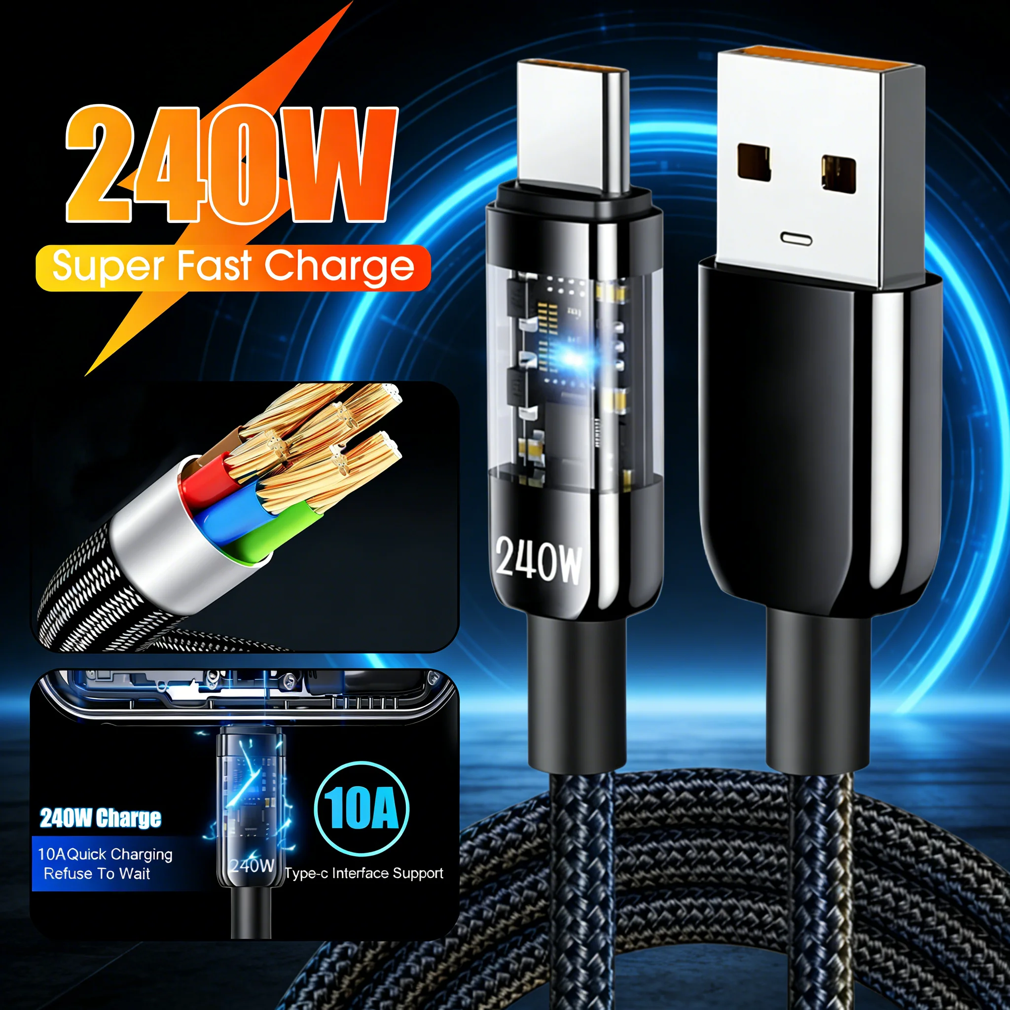 240W USB to Type C Super Fast Charging Cable 10A Nylon Data Cable With LED QC3.0 USB to Type C Cord For Huawei Samsung Xiaomi 15 $3.90
