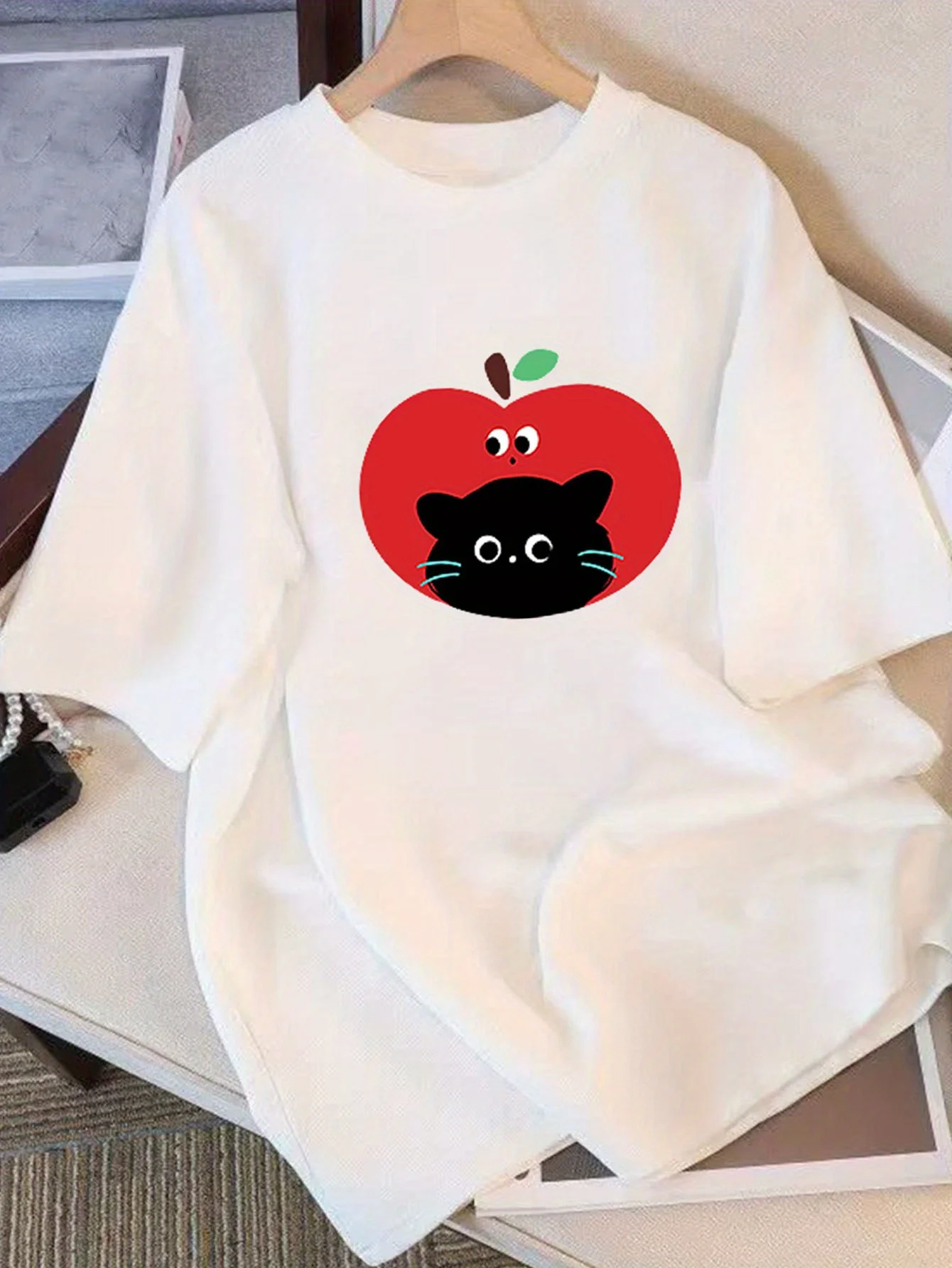 Women'S Casual T-Shirt with Cute Cat Apple Graphic Harajuku Casual T-shirt Clothing Street Tops Tees Aesthetic Clothes $13.71
