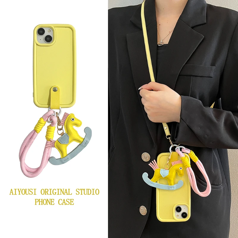 Simple milky yellow rocking horse pendant for apple 15promax phone case cartoon14promax fallproof iphone11 12 handheld crossbody $27.65