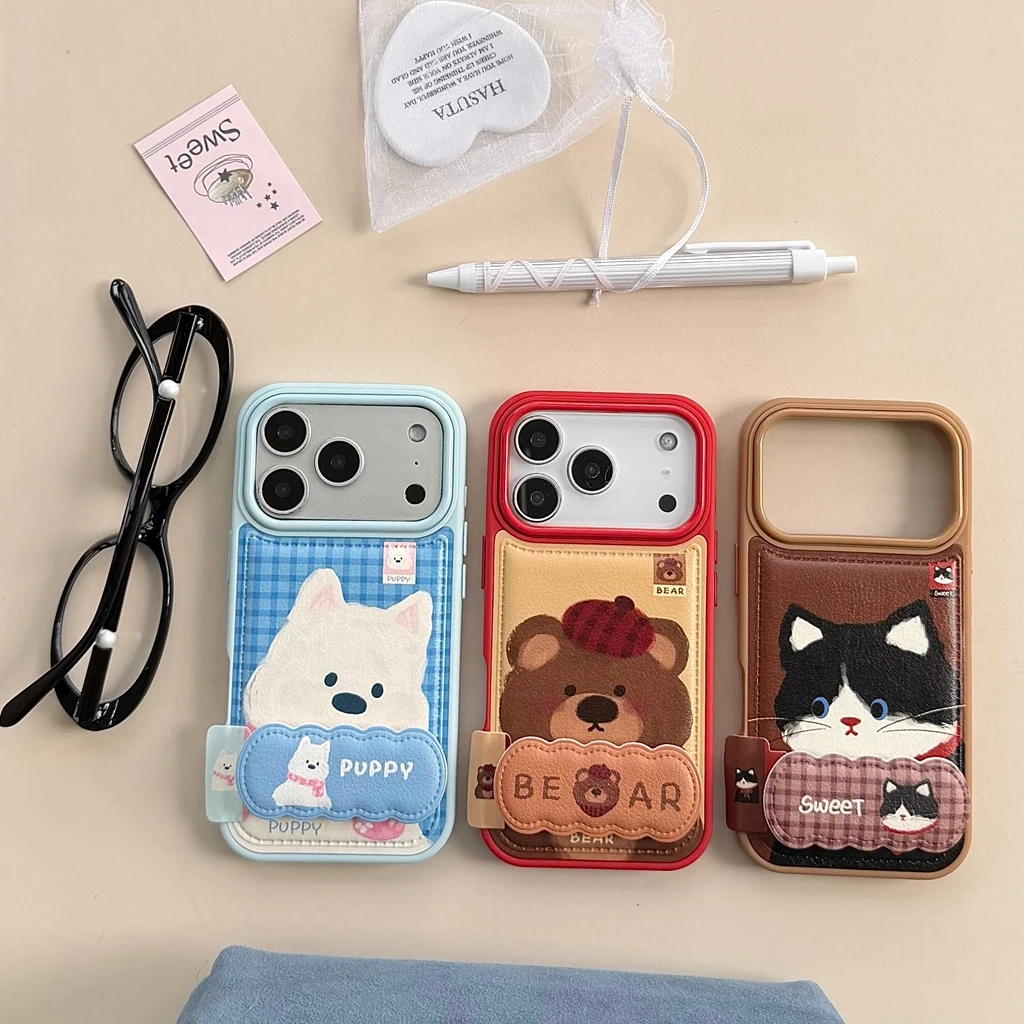 Autumn Winter Artificial Leather Cute Cartoon Animals With Folding Holder Phone Cover Case for iPhone 17 16 15 14 13 Pro Max $4.33