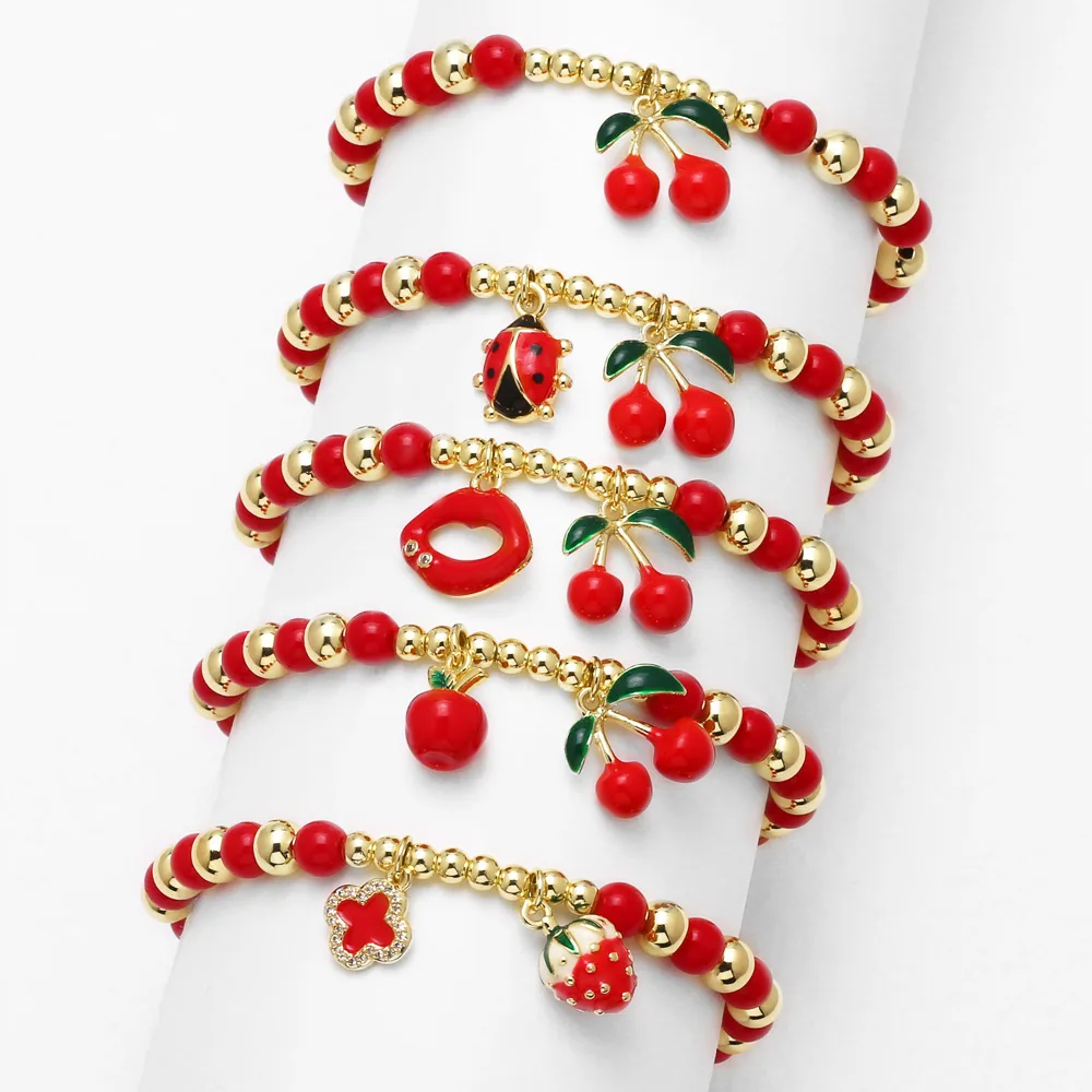 ASJEWELRY Beaded Chain Red Apple Cherry Bracelets for Women Gold Plated Ladybug Bracelets Cute Fruit Jewelry Gifts brtc20 $2.38