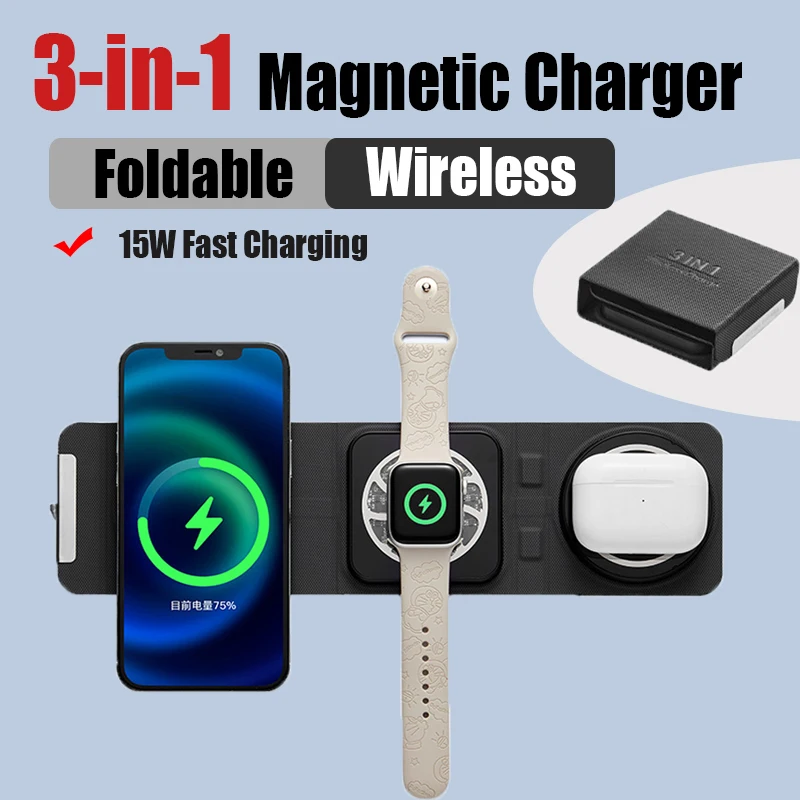 3 in 1 Foldable Charger Simultaneous Fast Charging for iPhone Watch AirPods Magnetic Wireless Power Dock $17.12