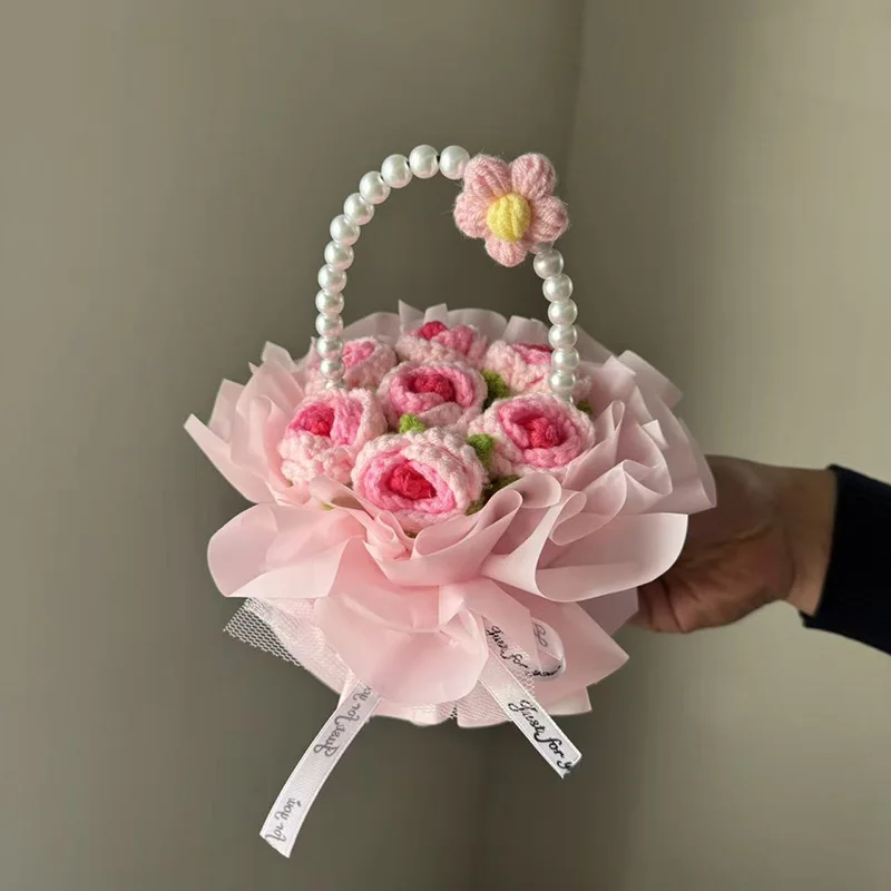 Crochet Flower Basket Decorations Artificial Knitted Flower Bouquet Valentine's Day Gift Flower Gifts for Lover $5.96