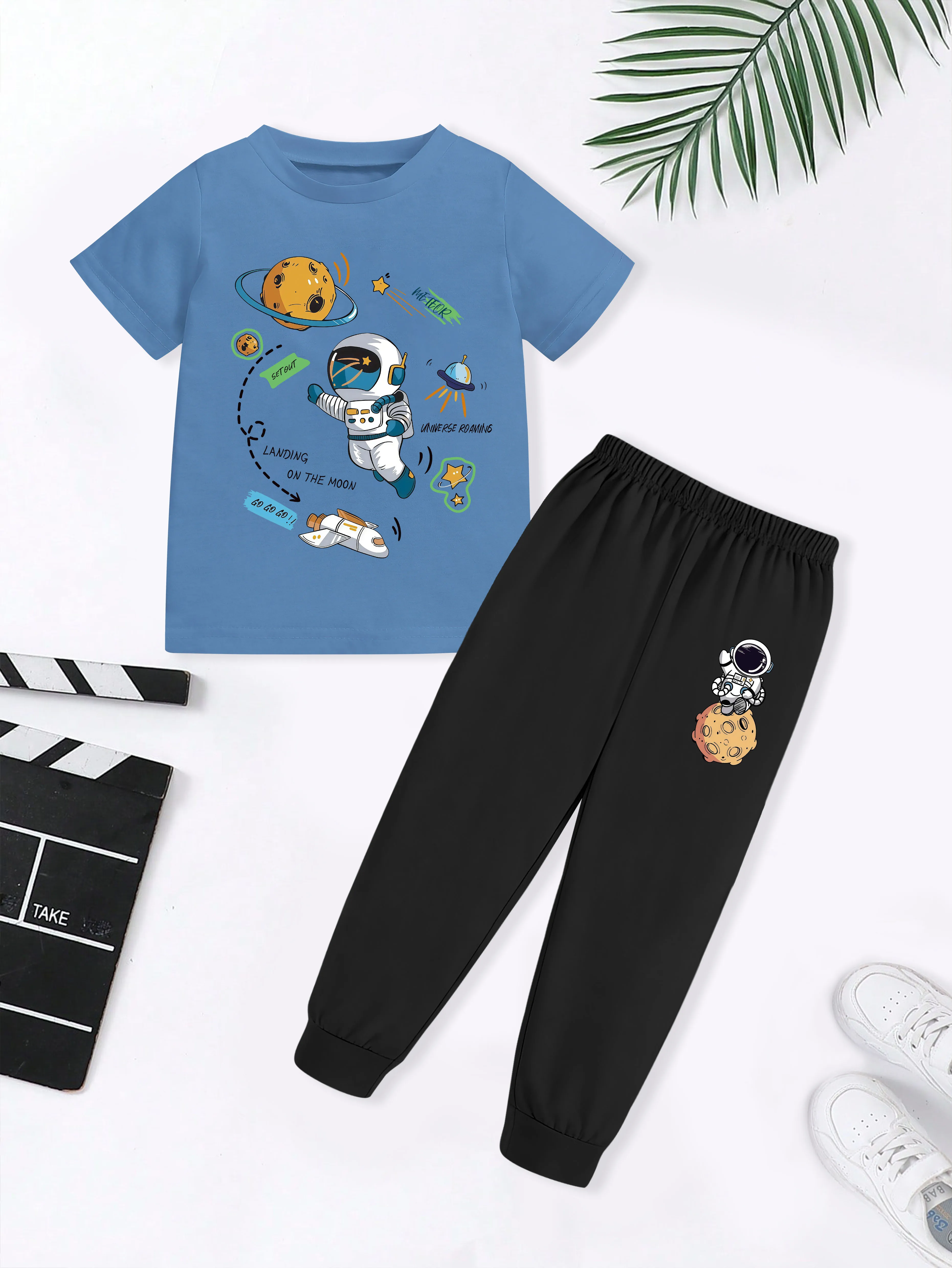 2 pieces, cartoon head design, boys' fashionable casual cute round neck short-sleeved T-shirt and sweatpants set $18.89