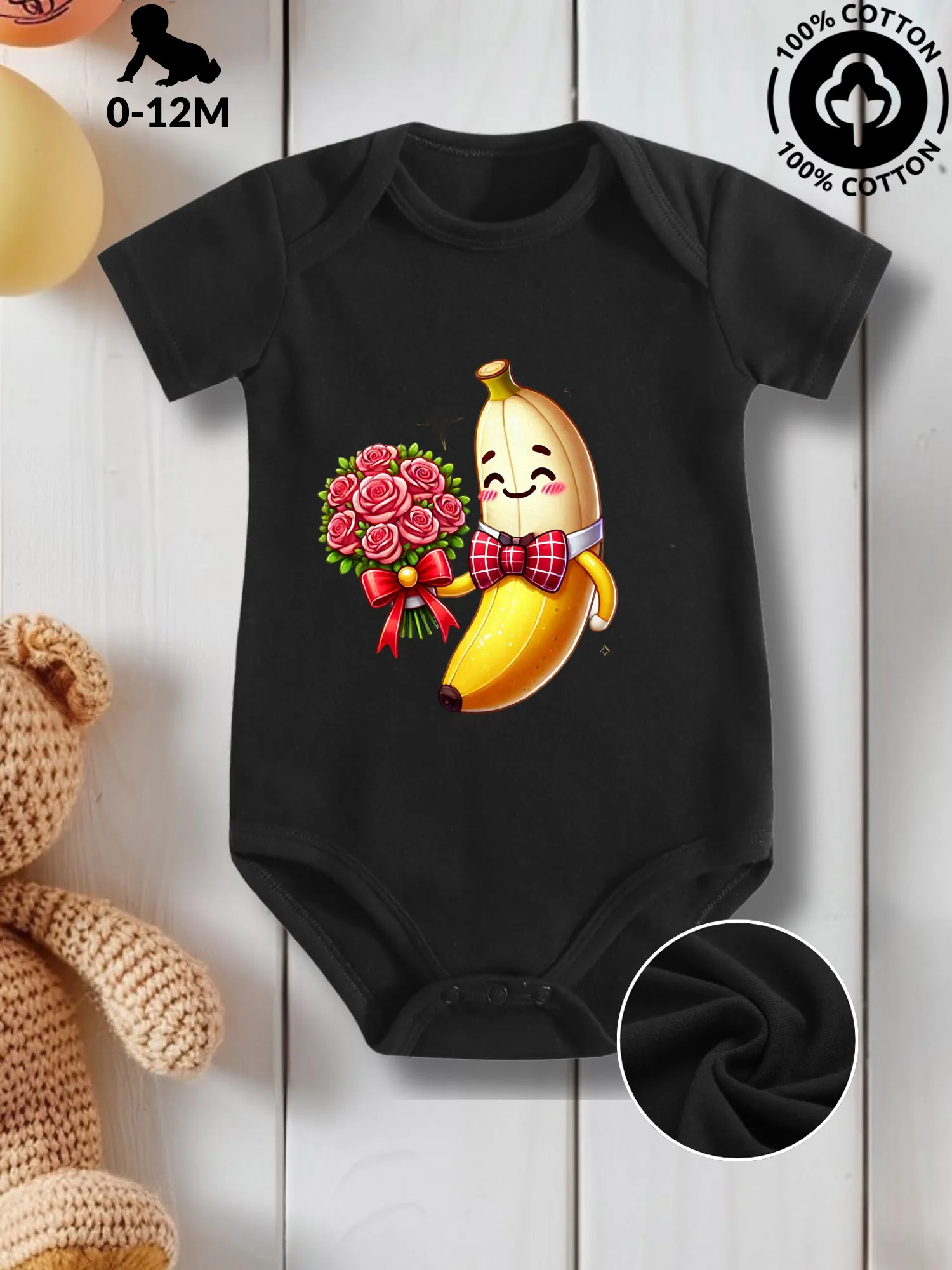 Cute Banana With Roses Unisex Baby Crawling Suit, Pure Cotton Skin Care Onesie, All-Season Wear Black Bodysuit 190GSM $4.69