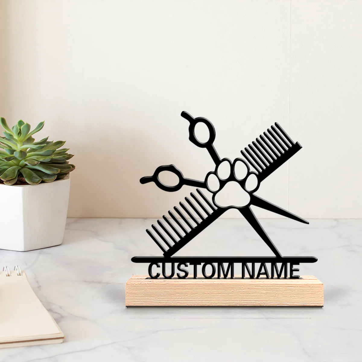 1pc Fun Personalized Custom Pet Grooming Metal Statues Modern Wooden Base Decor for Office, Living Room, Nature-Inspired $10.88