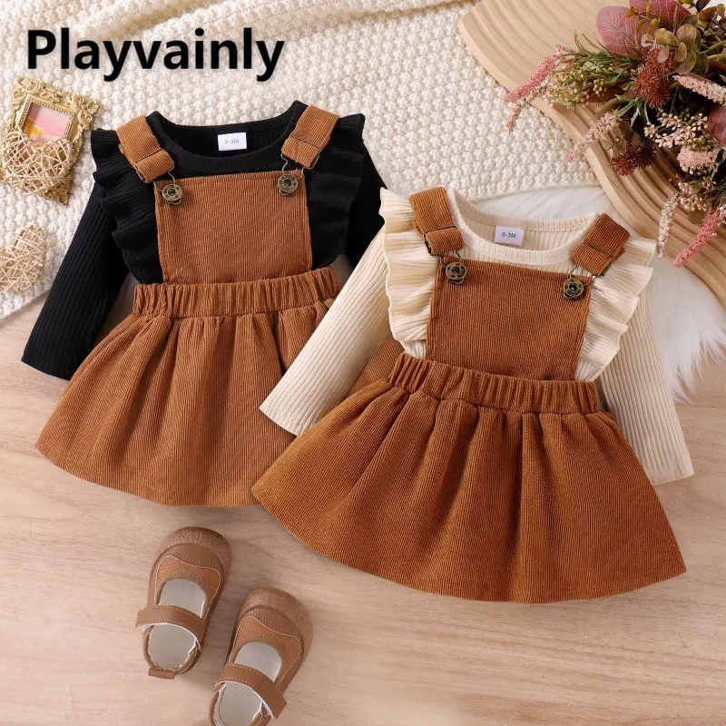 Girls Autumn Winter 2-piece Set Black Apricot Ruffle Long Sleeve Bodysuit+Elastic Waist Straps Skirt Trendy Baby Clothes H0049 $13.19