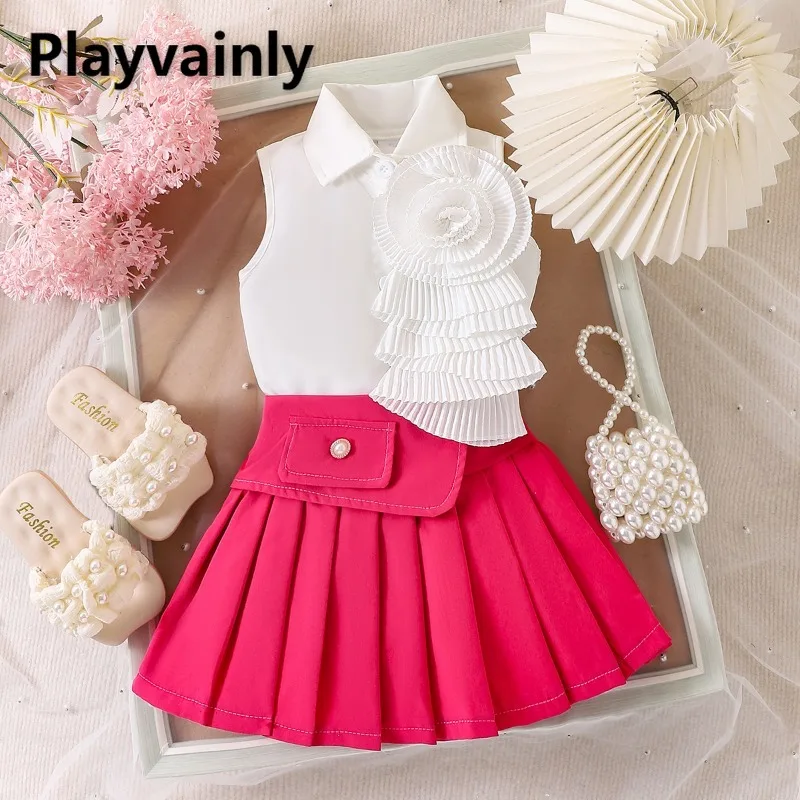 2025 New Summer Toddler Girl 2-Piece Set Turn-down Collar Floral Sleeveless Shirts+Pleated Skirt Kids Outfit Everyday Wear A0234 $20.79