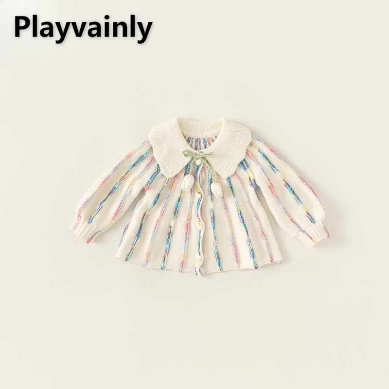 Color Blocking Baby Girls Sweaters Cardigan Spring Autumn Colorful Stripes Peter Pan Collar Knitted Coats Children Clothes Y5200 $26.64
