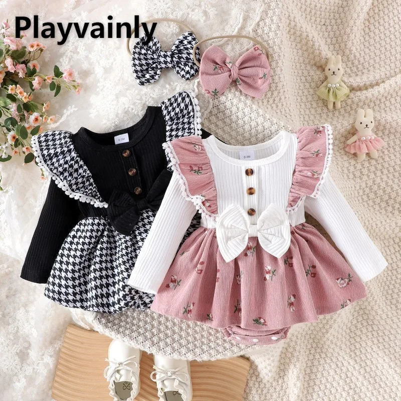 Baby Girls Spring Autumn Black Pink Ruffle Long Sleeve Bow Bodysuit with Skirt Matching Headwear Birthday Princess Clothes Y0274 $14.56