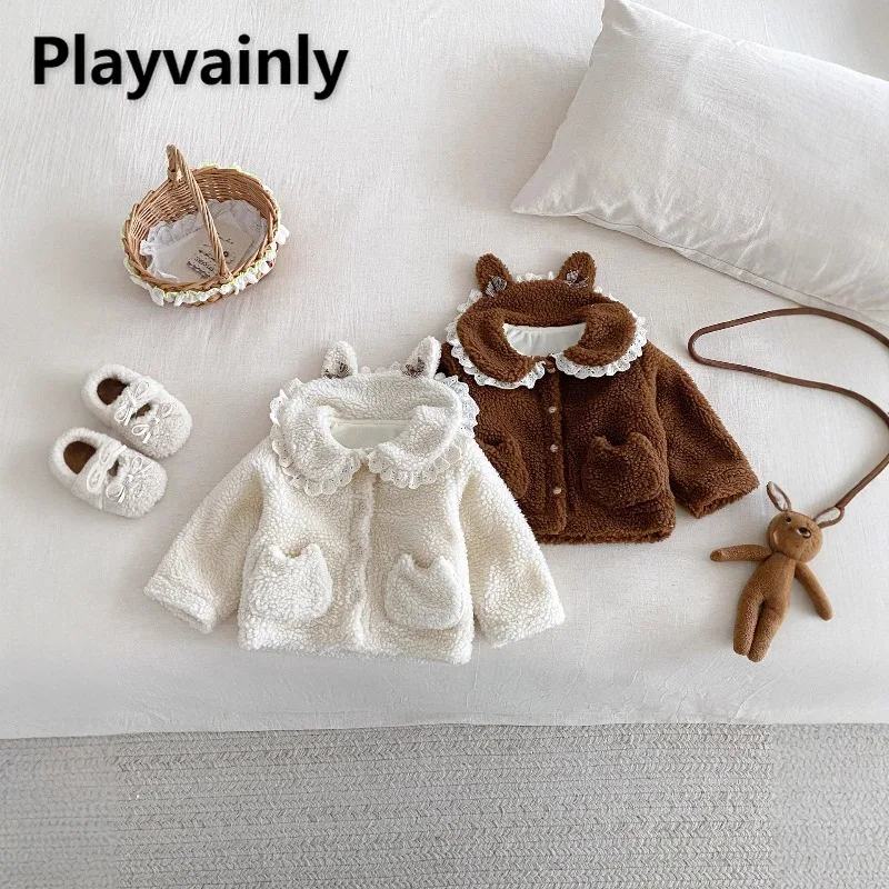 Korean Style Winter Baby Girls Cute Fleece Coats Light Beige Dark Brown Lace Turn-down Collar Thickened Warm Plush Outwear Z859 $27.94