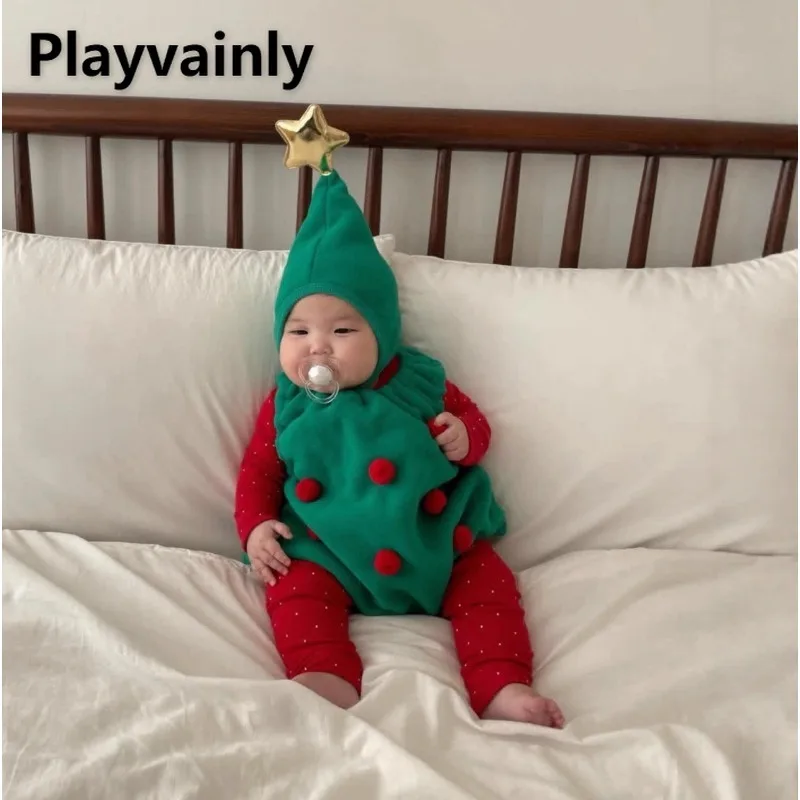 Korean Style Christmas Outfit for Toddler Girl Boy Green Vest Bodysuit Red Polka Dot Long Sleeve Sets Xmas Party Clothes A8195-1 $18.19
