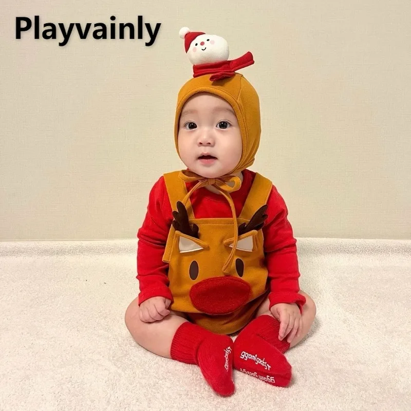 2025 Autumn Christmas Baby Crawling Suit Red Long Sleeve T-shirt+Sling Bodysuit+Cute Hat+Socks Boy Girl Xmas Party Outfits A8192 $27.29