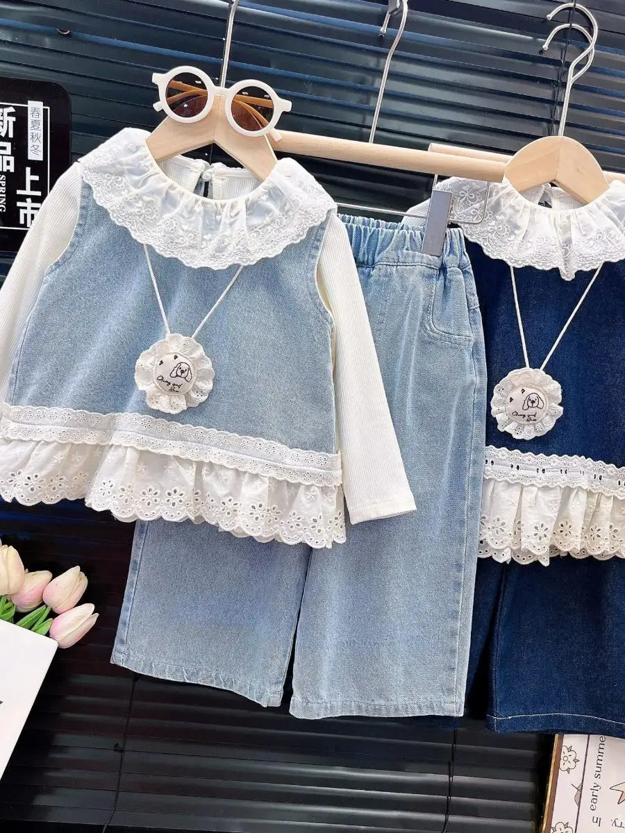 Spring New Faionable Korean Sle Girls' Denim Tee-Piece Set Long Sve Long Pants Baby Girls' Outfit Casual Sportswear $24.99