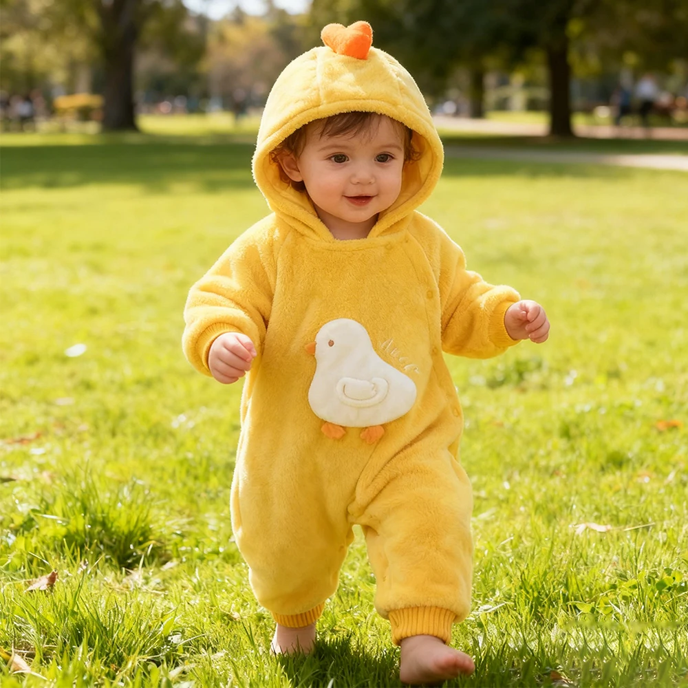New Winter Baby Outdoor Thick and Plush Cute Three-dimensional Yellow Duck Solid Color Hooded Jumpsuit Soft Fleece Jumpsuit $21.47