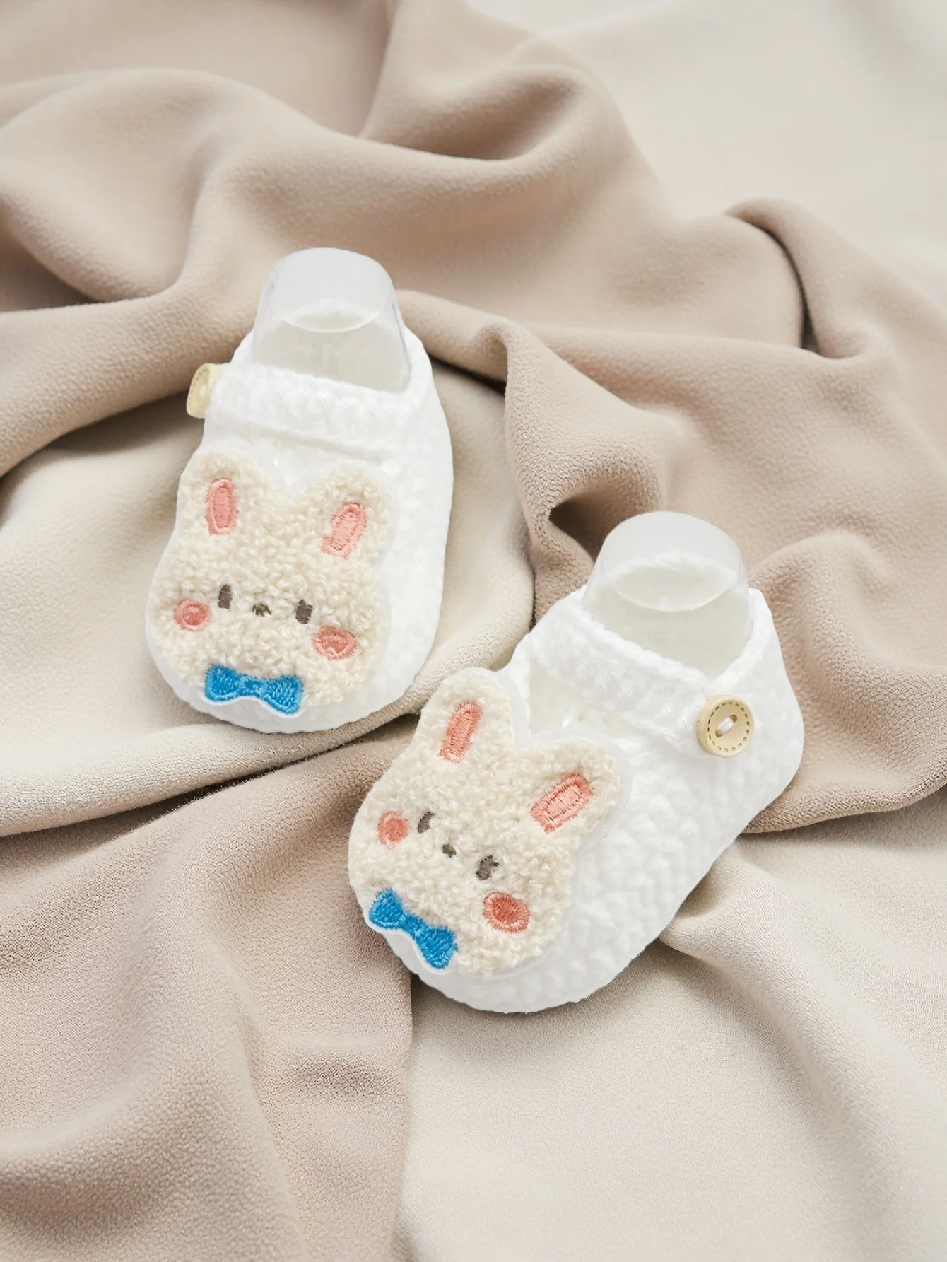 1 Pair Cute Bunny Baby Booties, White Knitted Slipper Shoes with Blue Bow, Soft Infant Footwear with Button Closure, 0-12 Months $6.80