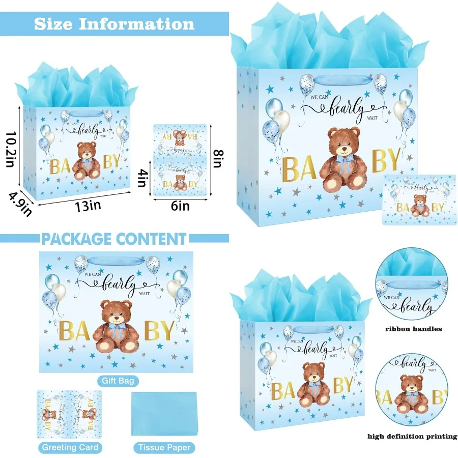 13 Large Baby Shower Birthday Gift Bag with Tissue Papers and Card Blue Balloons Bear Design Convenient Handles Ideal for Baby $7.62