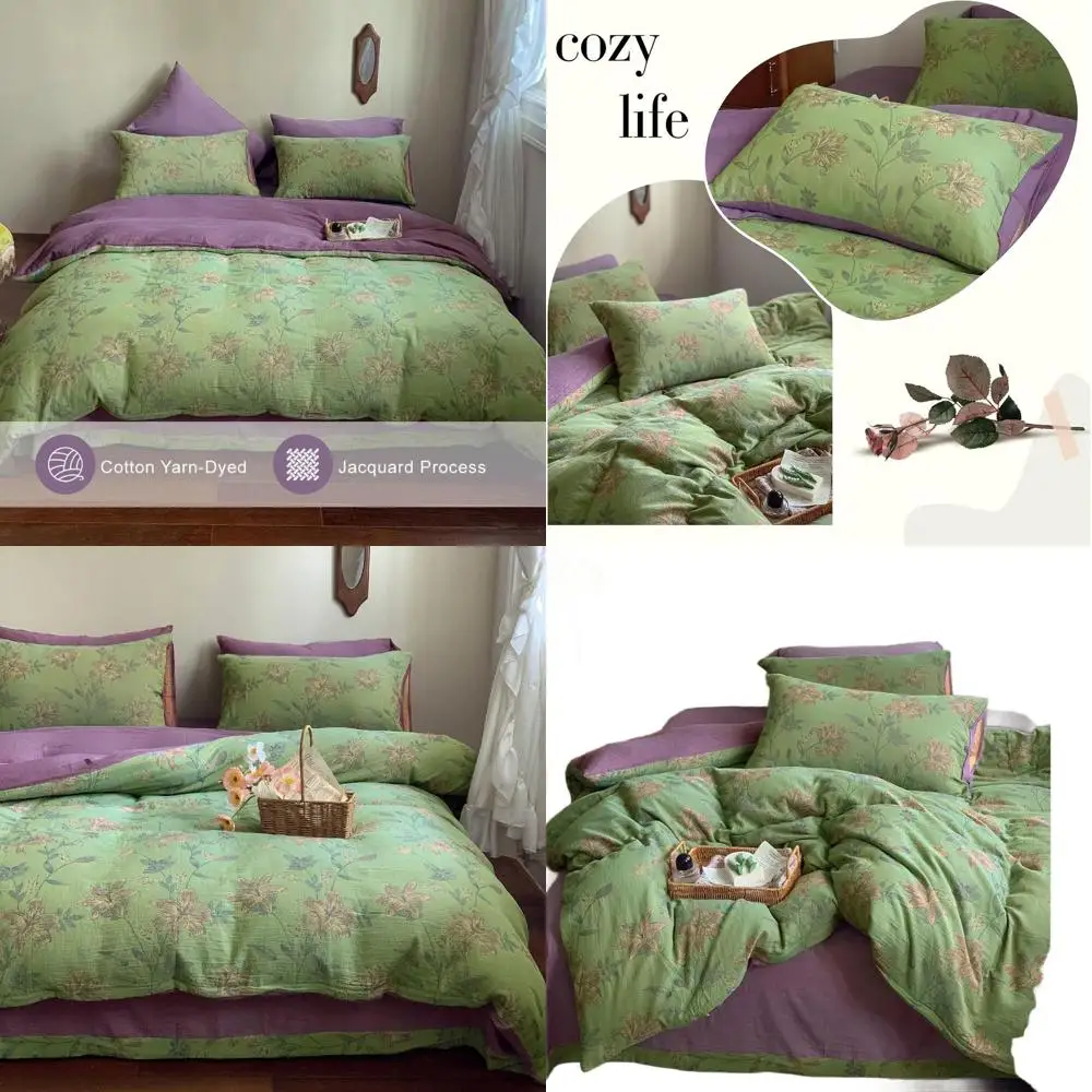 Linen Cotton Jacquard Duvet Cover Queen,3 Pcs Yarn-Dyed Textured Duvet Cover Set Green Purple Floral Bedding Breathable, Natural $88.64