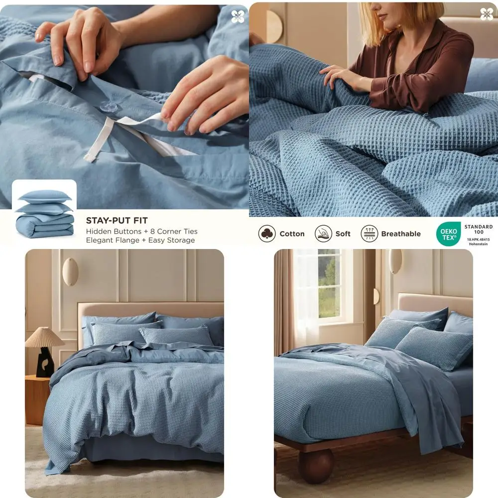 Cotton Duvet Cover Queen - 100% Cotton Waffle Weave Grey Blue Duvet Cover Queen Size, GentleSoft™ and Breathable Bedding Set for $92.76