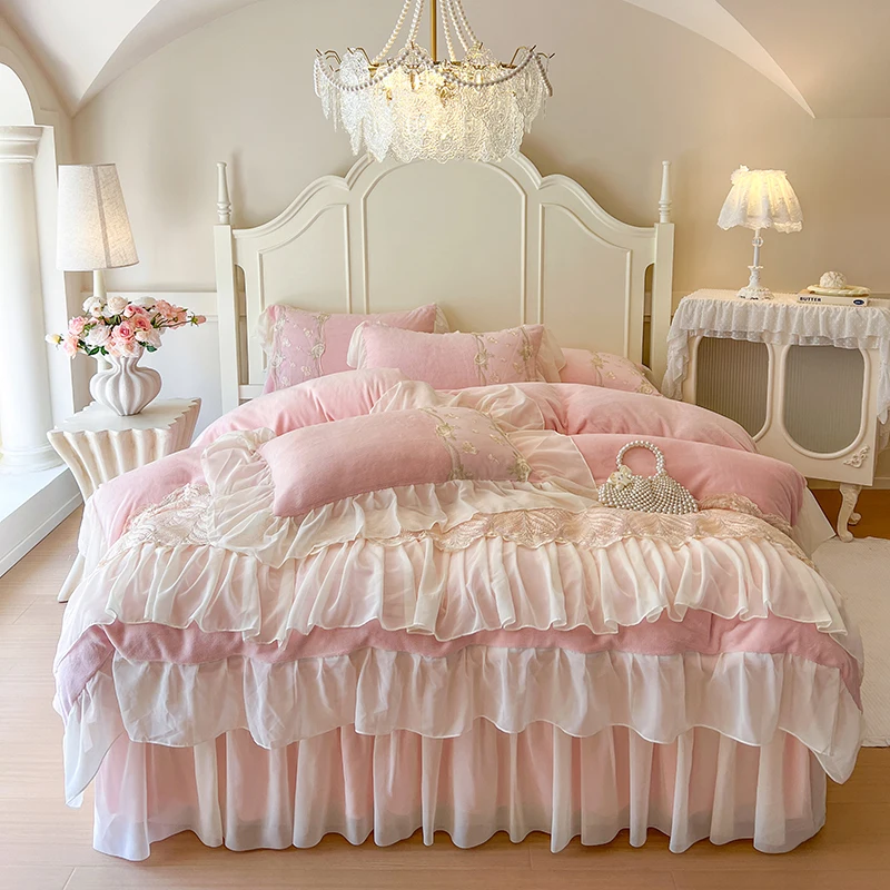 Lace Ruffles Embroidery Milk Velvet Winter Warm Thickened Princess Bedding Set Duvet Cover Bed Skirt Bedspread Pillowcases 4Pcs $104.99