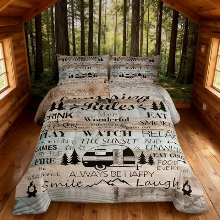 Happy Camping Camper Comforter Set SizeRustic Farmhouse Adventure Cabin Bedding Set Girls Boys Room Decor Wooden Plank Cottage $79.07