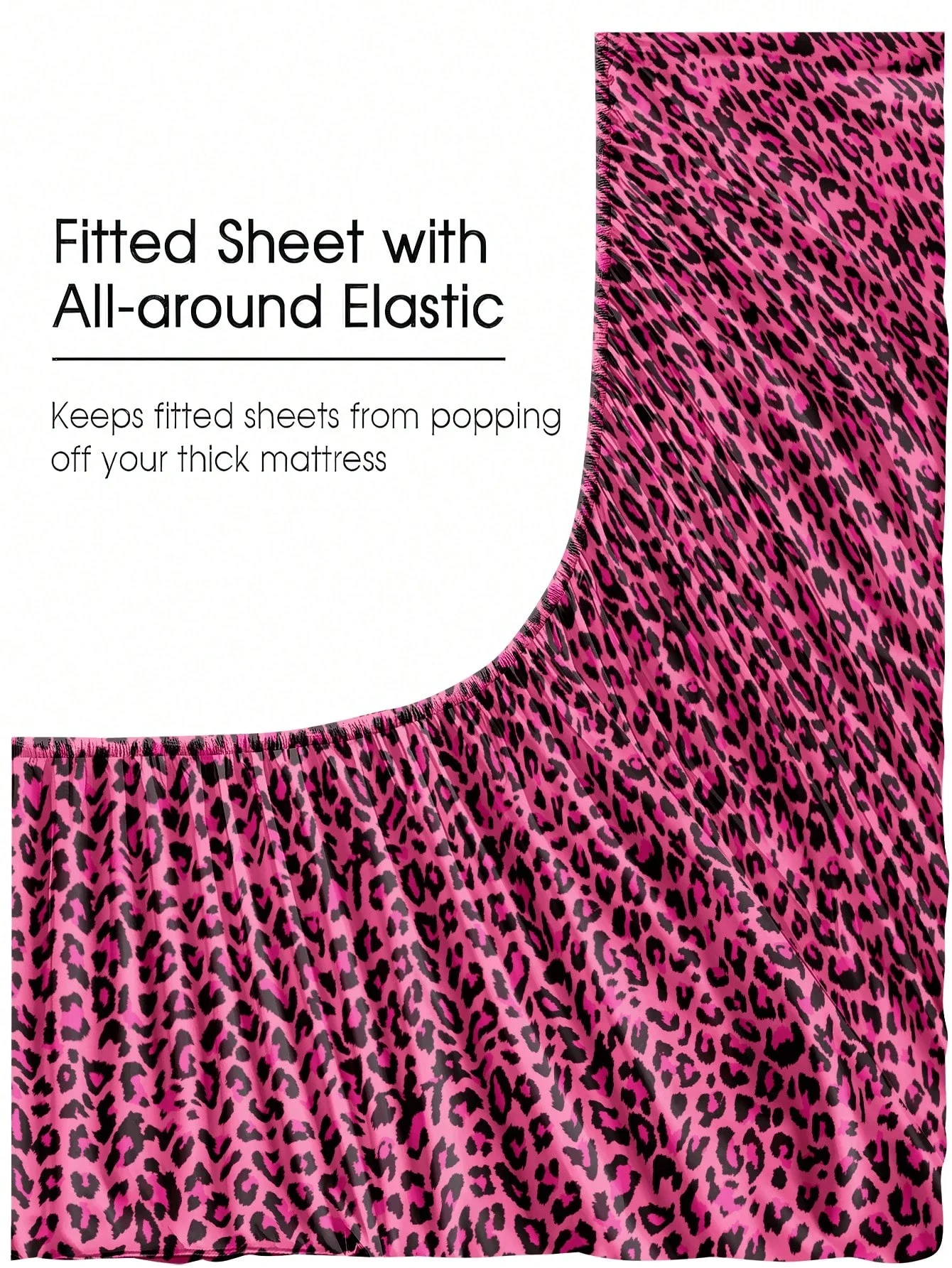 4Pcs Dark Pink Leopard Print Bedding Set Fitted Sheet Flat Sheet 2 Pillowcases Deep Pocket Up To 11.8 Inch $41.21