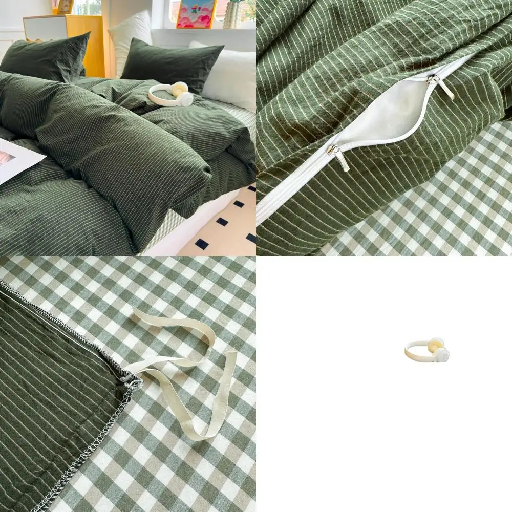 King Size Olive Green Striped Cotton Duvet Cover Set - 3-Piece Pinstripe Bedding with Zipper & Corner Ties $71.17