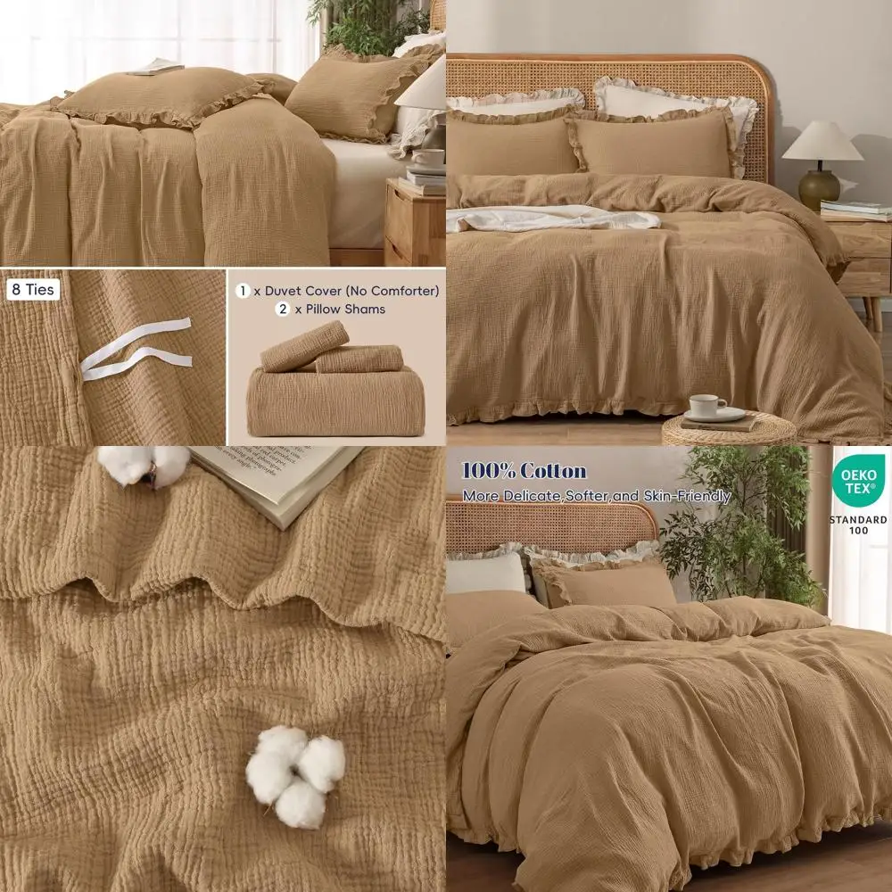King Size 100% Natural Cotton Muslin Ruffle Duvet Cover Set, Soft Breathable, Minimalist Luxury Bedding, 104x90, Brown $95.92