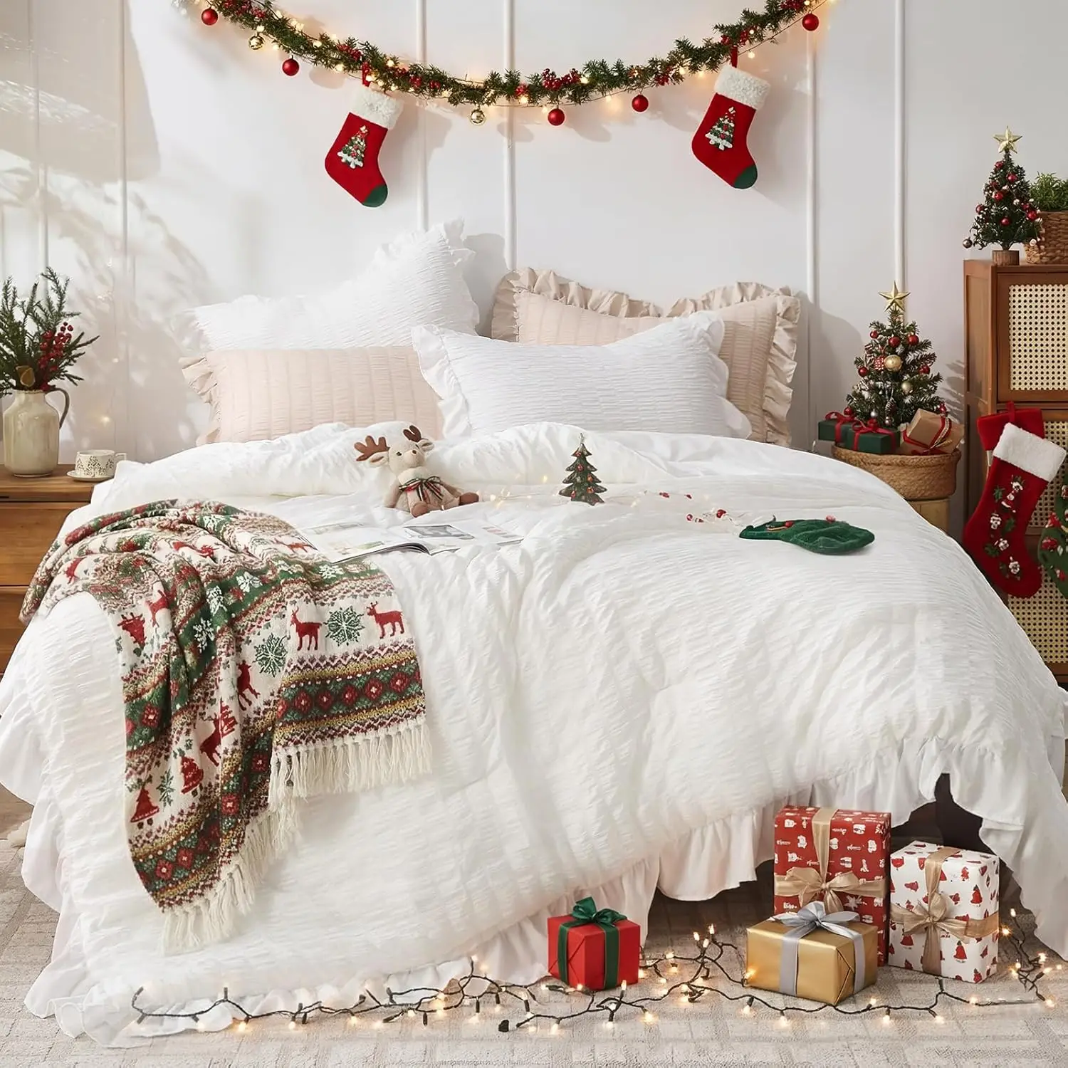 Queen Comforter Set, White Seersucker 3-Piece Lightweight Bedding with Ruffles for All Seasons $54.00
