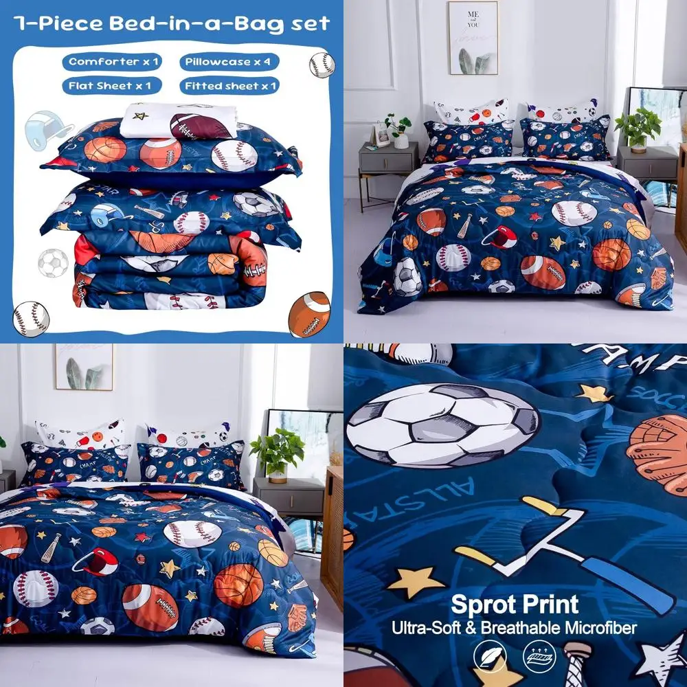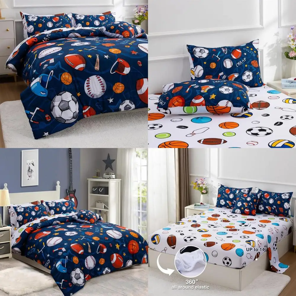 7-Piece Full Size Sports Themed Bedding Set for Kids: 1 Comforter, 1 Flat Sheet, 1 Fitted Sheet, 2 Pillowcases, 2 Shams $84.99