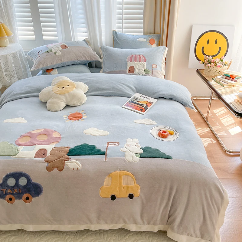 Thiened Double-sided Milk Velvet Four-piece Set Cute Bedding Cover Warm Coral Velvet Bed eet Cartoon Bedding Accories $107.67