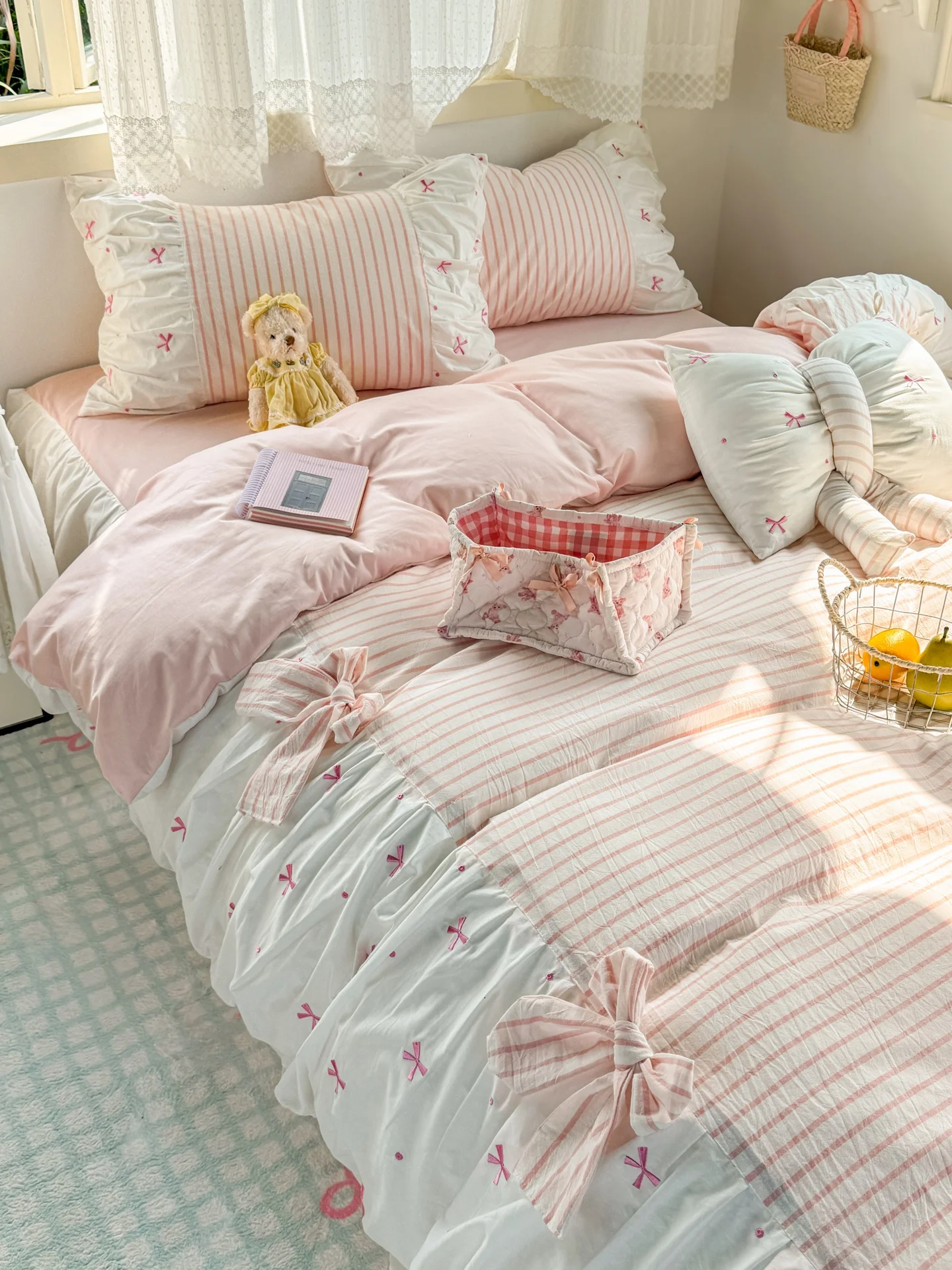Sweet Powdered Knot Embroidered Soft Pure Cotton Bedding Set Style Close-Fitting Dustproof Bed Canopy Four-Pi... $15.23