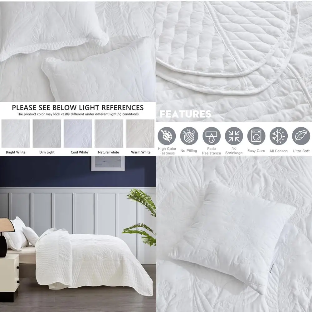 Queen Size Oversized Leaves Pattern Quilt Set - Elegant & Fresh Style Bedding Coverlet, Reversible, Lightweight, 5 Piece, White $113.64