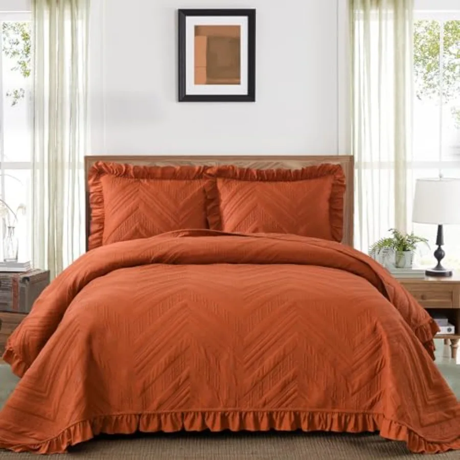 Fall Queen Quilt Bedding Set Burnt Orange Ruffled Bedspread Coverlet Basket Weave Terracotta Quilted Thin Blanket Bed Cover for $51.73