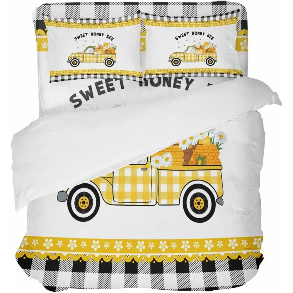 Home Bedding Set 4 Piece Duvet Cover Set Caliornia King Size Sweet ey Yellow Truck BuPlaid Border Sot Bed Sheets Duvet Cover lat $159.09