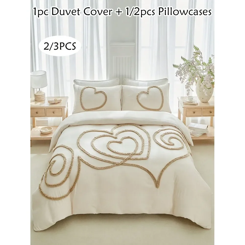 3pcs Khaki Heart Pattern Tufted Polyester Duvet Cover Set, Shabby Chic Modern Luxury Queen Size Bedding Set For All Seasons 1 Du $18.44
