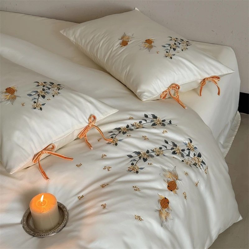 1000TC Egyptian Cotton Flowers Goldfish Embroidery Lace-Up Luxury Bedding Set Duvet Cover Flat/Fitted Bed Sheet Pillowcases 4Pcs $94.84