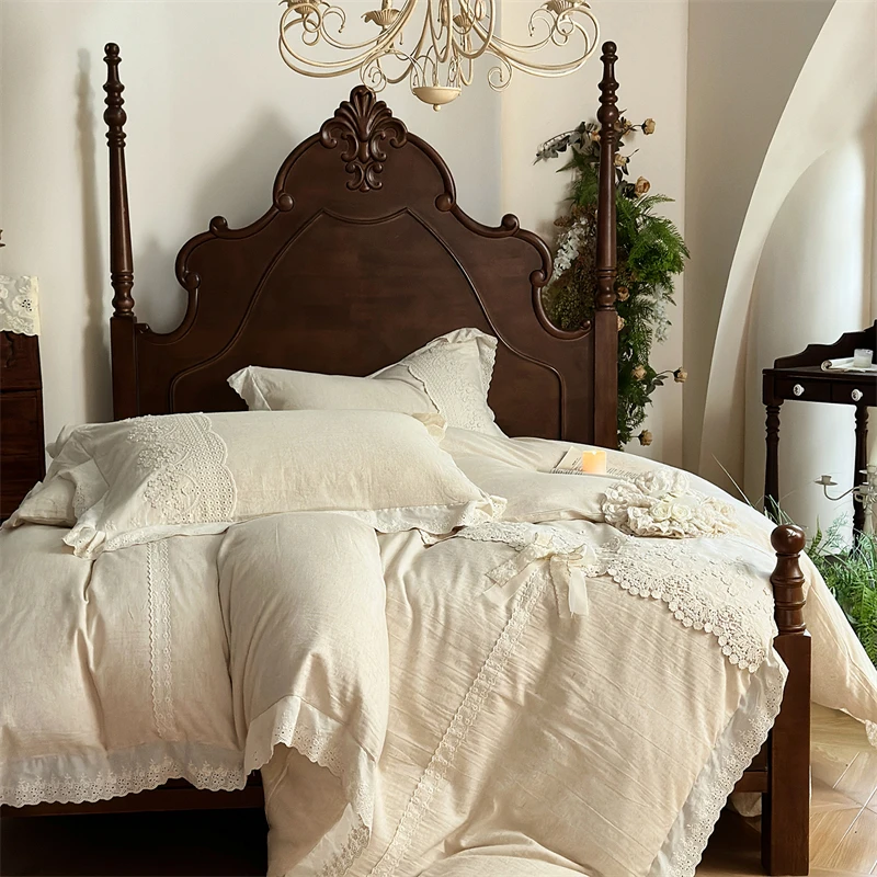 Natural Linen Cotton Lace Edge Bow Princess Bedding Set Double Queen King Size Duvet Cover Flat/Fitted Bed Sheet Pillowcase 4Pcs $104.65