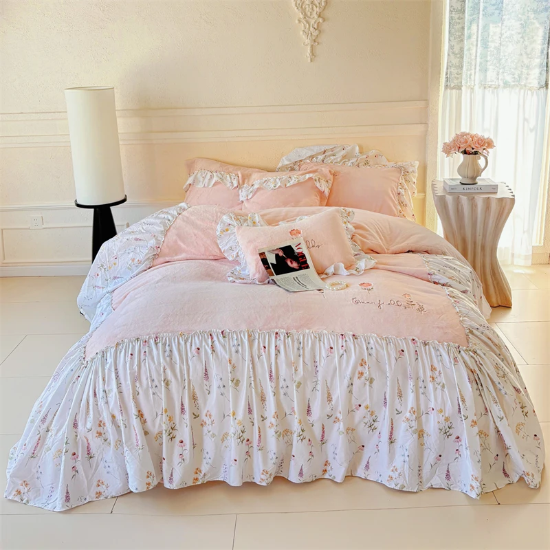 Pink Flowers Embroidery Floral Print Large Ruffles Princess Bedding Set Velvet Duvet Cover Flat/Fitted Bed Sheet Pillowcase 4Pcs $128.91
