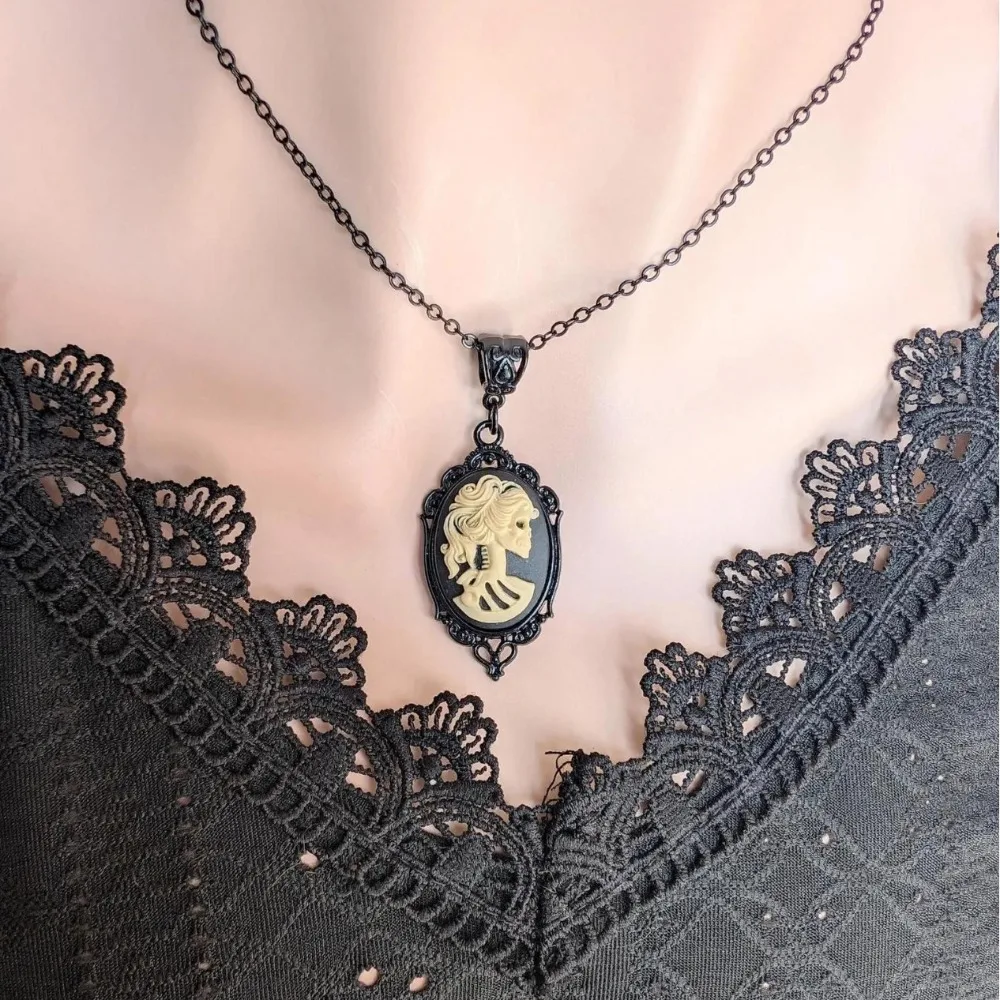 Vintage Exquisite Gothic Embossed White Lady Portrait Skull Oval Black Pendant Necklace for Woman Halloween Jewelry Accessories $2.35