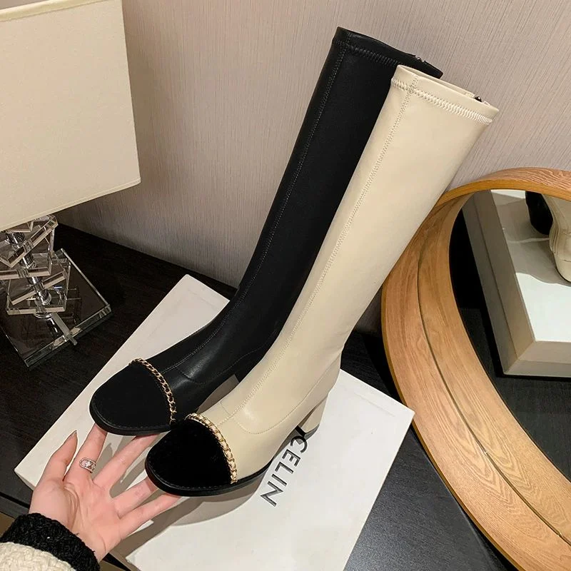 Metal Chain Riding Boots Women Patchwork Round Toe Chunky Heel Knee High Boots 2026 New Fashion Casual Genuine Leather Boots $99.56