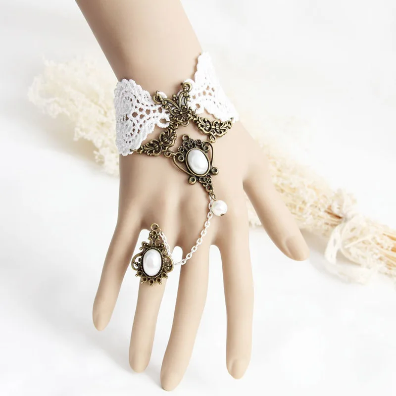 Womens Floral Pearl Drop White Lace Adjustable Ring Bracelet Slave Set Handmade Bridal Wedding Gothic Vintage Fashion Jewelry $3.99