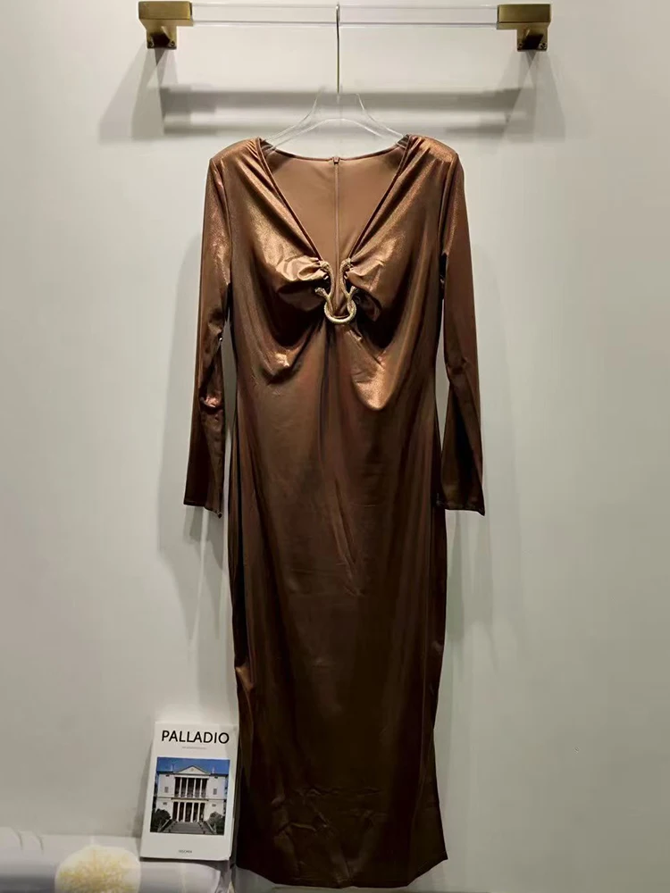 V-neck metal buckle design pleated waist-cinching dress, fashionable tight-fitting dress for autumn 2025 women's wear $55.37