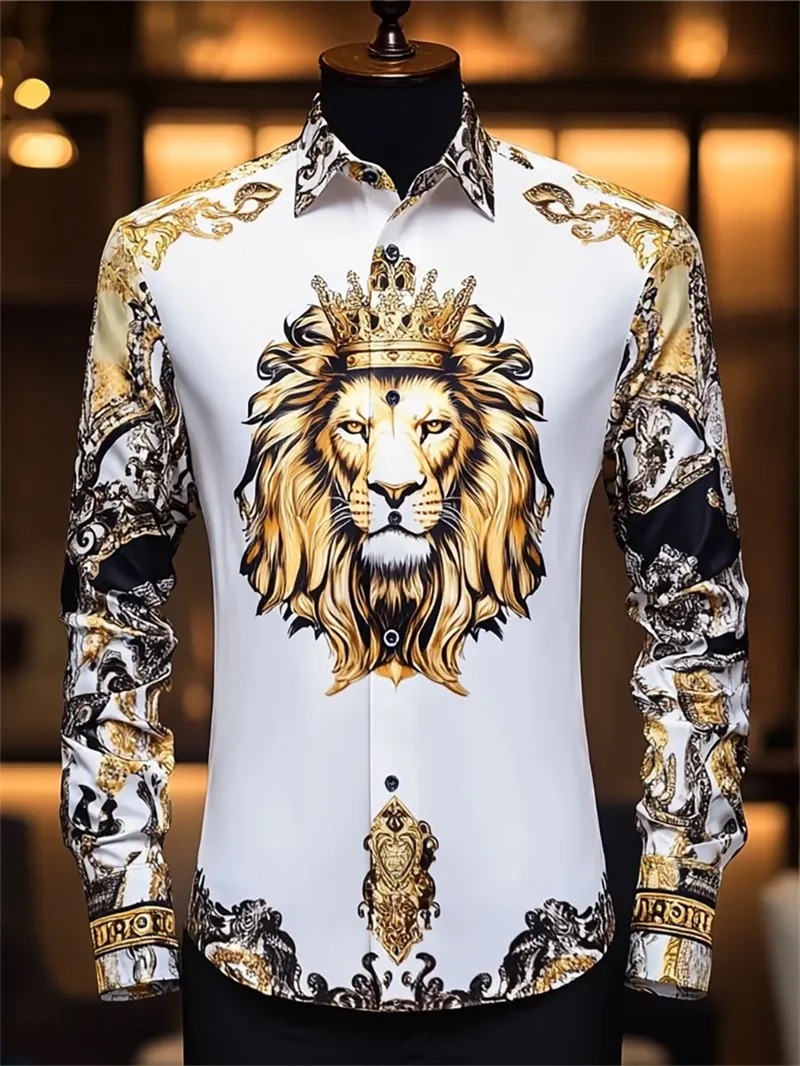 New men's long sleeved shirt with gold 3D lion print technology, fashionable pattern, luxurious shirt style $7.77