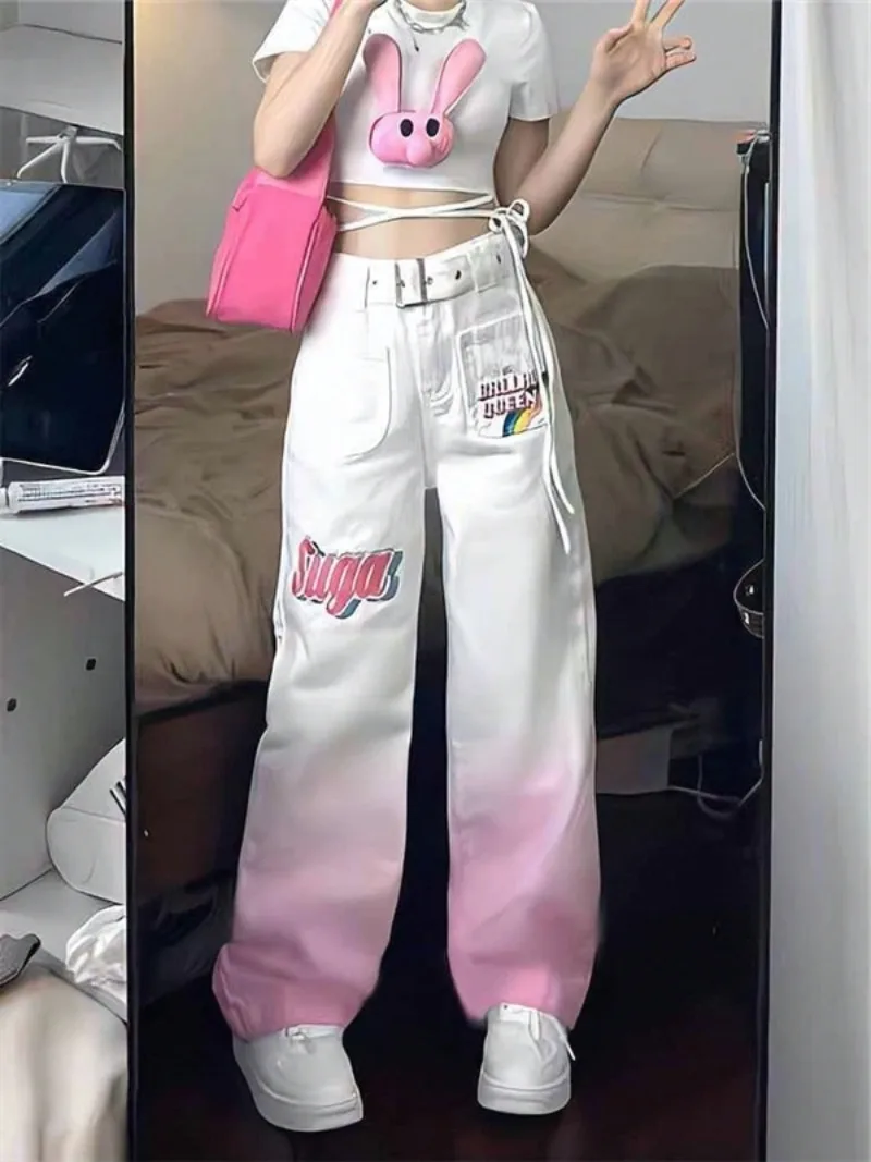 Trendy Cotton Long Pants American Retro adient Pink Print Jeans Women's High Waist Loose Straight Leg Floor-Length Trousers $30.48